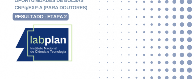 O INCT Labplan torna público o resultado dos aprovados para a segunda etapa da seleção de três (03) bolsas CNPq/EXP-A destinadas a doutores. As candidaturas abaixo foram consideradas as mais aderentes aos Eixos Temáticos do INCT, passando para a fase seguinte.