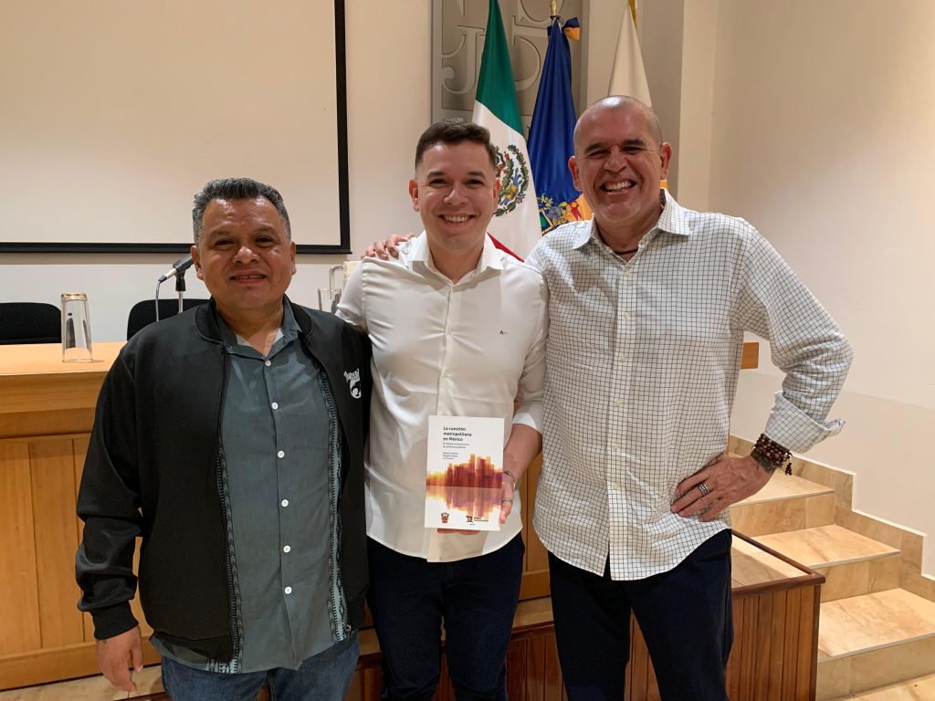 Dr. Alberto Arellano (Coljal), doutorando Brunno Costa (pesquisador Labplan), Dr. Magdiel Gómez (UdeG) no lançamento do livro “La cuestión metropolitana en México. El debate inconcluso en las políticas públicas”, no Coljal.