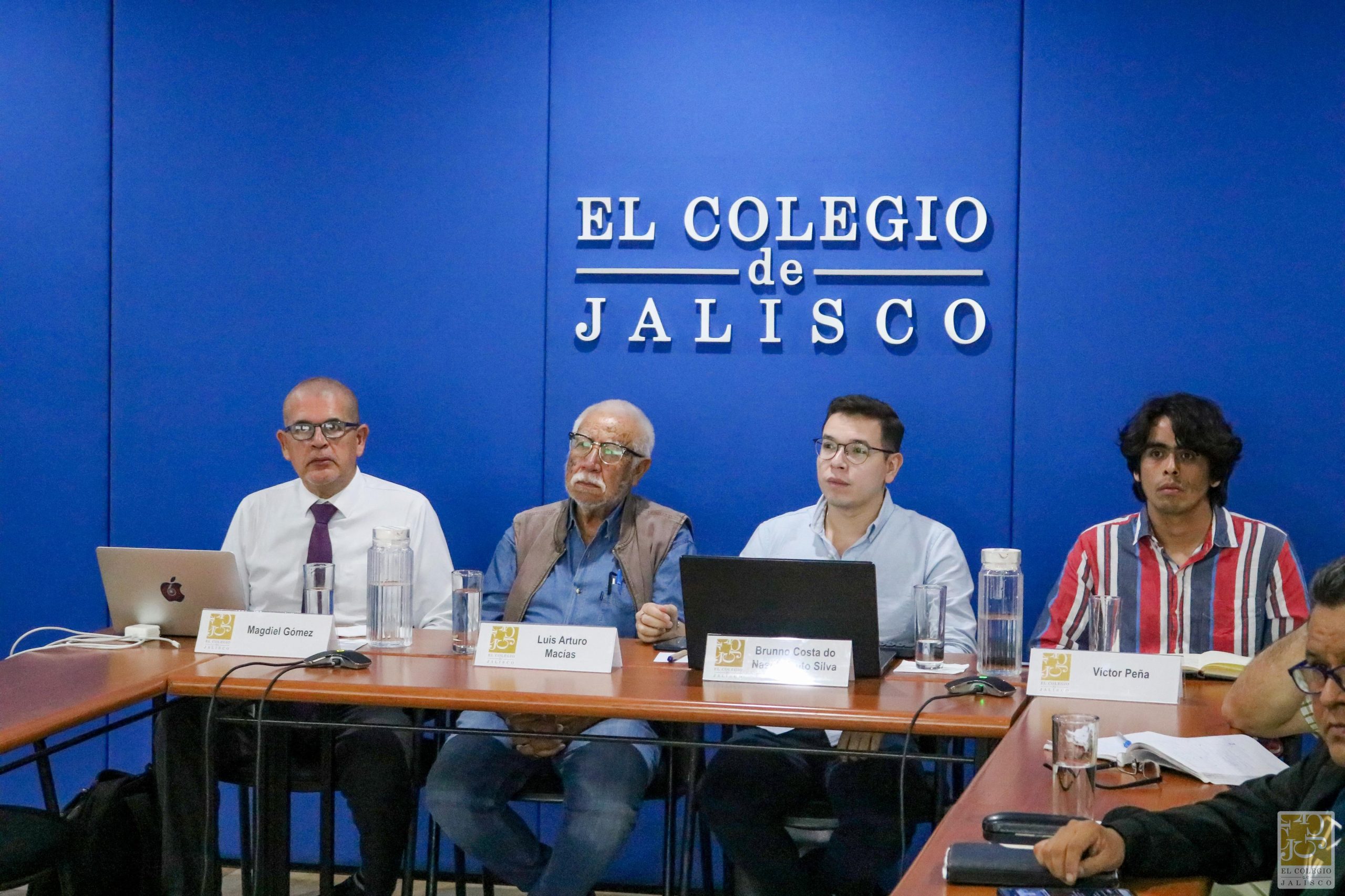 Dr. Magdiel Gómez (UdeG), Dr. Luis Arturo Macías (UdeG), doutorando Brunno Costa (pesquisador Labplan), doutorando Victor Peña (Coljal) e Dr. Alberto Arellano (Coljal) na Jornada Acadêmica “Metrópolis Emergentes en América Latina”, no Coljal.