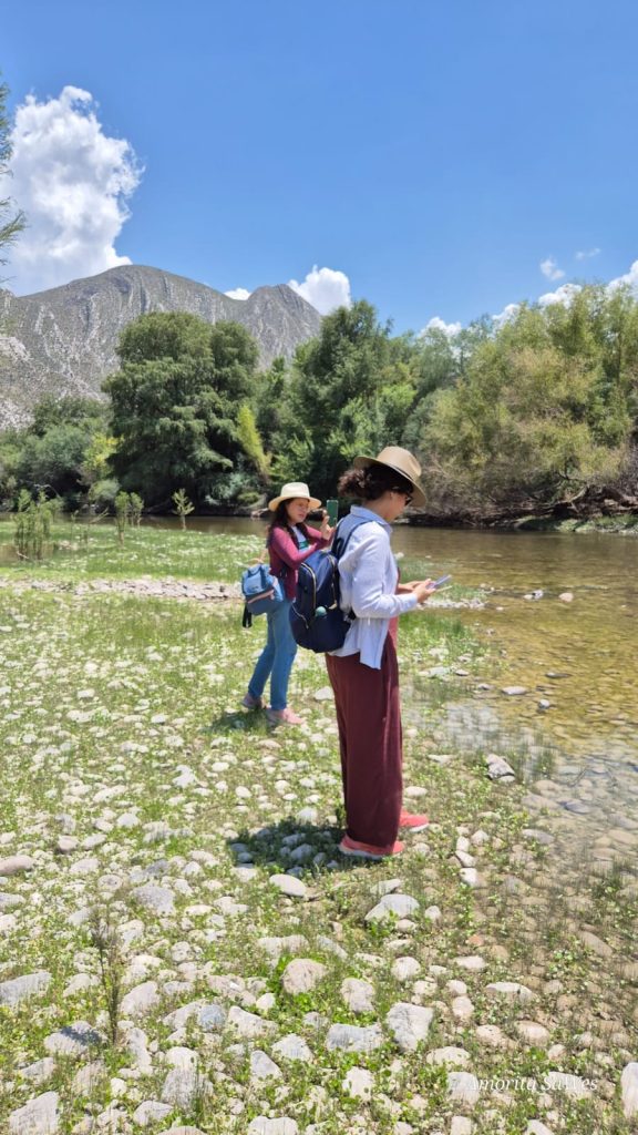 Doutorandas Yonara Santos e Ana Célia Araújo em atividade de campo no Rio Nazas, área de semiárido e limite entre os estados de Durango e Coahuila, na região de La Laguna, norte do México.